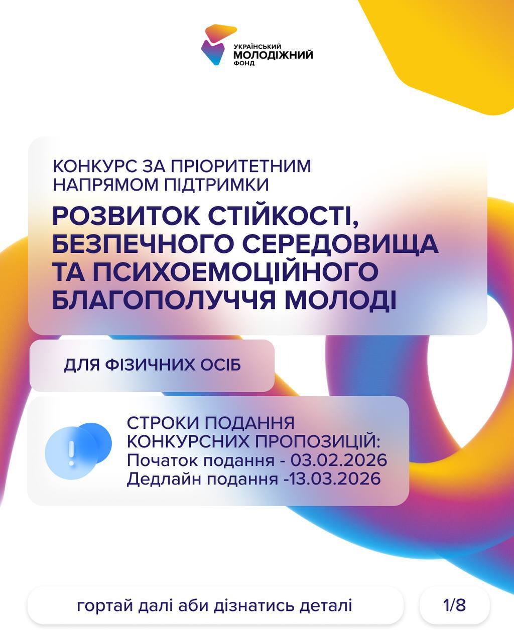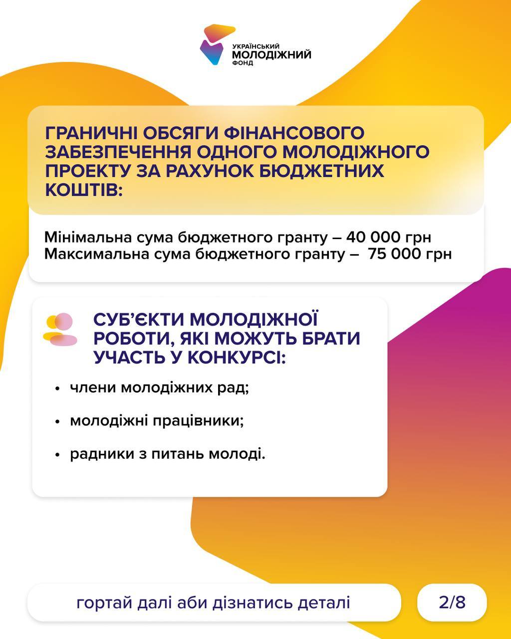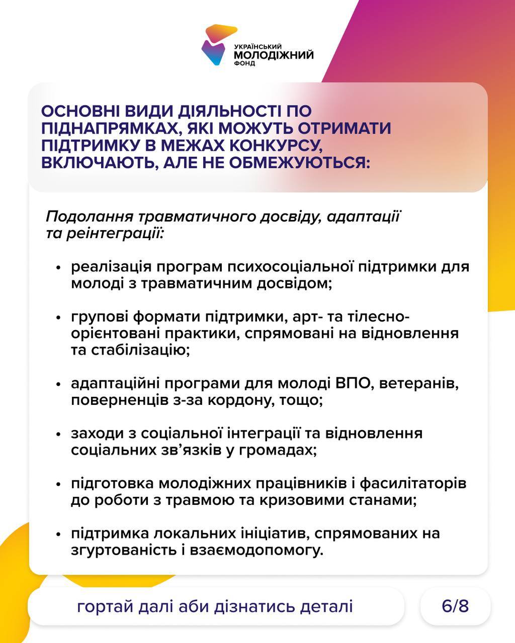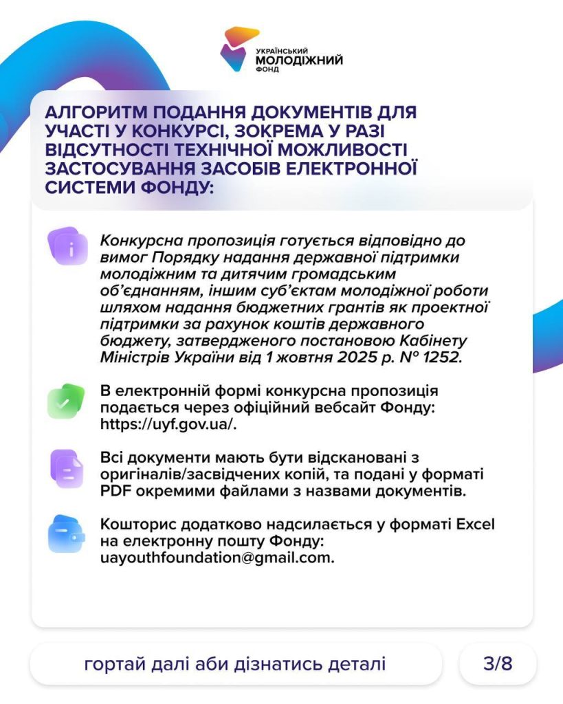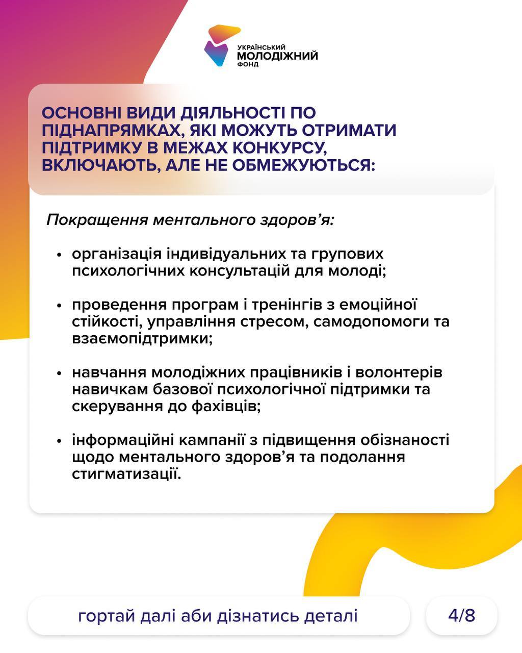 Коротко інформацію виклали на картинках, а от детальну інформацію знайдете на сайті УМФ – https://uyf.gov.ua/programs/blahopoluchchia-molodi-fo