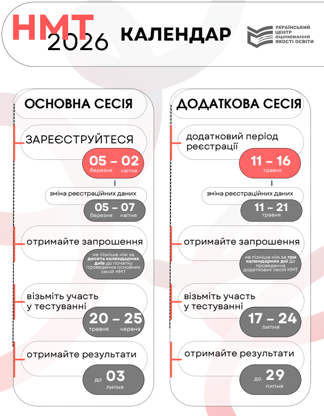 Відповідно до наказу Міністерства освіти і науки України від 24 грудня 2025 року № 1701 тестування відбуватиметься під час основних і додаткових сесій. Основні проходитимуть протягом 20 травня – 25 червня; додаткові — 17–24 липня.